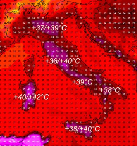 Questa volta l’alta pressione è abbastanza potente da arrivare a coinvolgere uniformemente tutto il territorio nazionale; il picco assoluto di caldo per le regioni del sud viene raggiunto tra oggi e domani, con valori previsti che alla quota di 850hPa (circa 1500 metri) toccheranno punte di +30°C sulle isole maggiori. Questo significa che al suolo la colonnina di mercurio potrà spingersi ancora per domani fino a valori di +40/+42°C nelle aree interne e lontane dal mare. Stima delle temperature MASSIME previste al suolo giovedì 12 agosto: