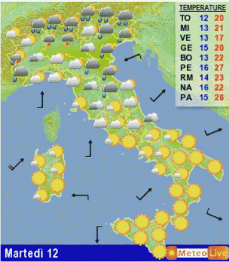 La prima mappa mostra le previsioni grafiche valide per domani, martedi 12 maggio: