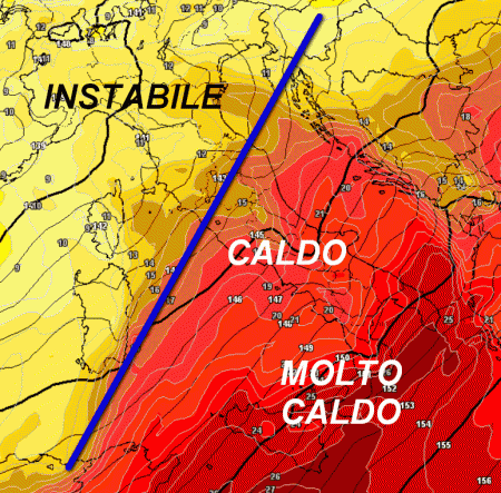 Con la linea blu abbiamo segnato l’ipotetico confine tra il bel tempo e il caldo del meridione e il tempo instabile delle regioni settentrionali.
