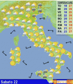Lunedi 24 nubi in aumento al nord e al centro con qualche rovescio nelle zone interne appenniniche, ancora soleggiato e caldo altrove.