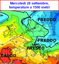 Il grosso dell’irruzione fresca, che per alcune regioni sarà anche fredda, è previsto nelle giornate di martedi 25 e mercoledi 26 settembre (terza mappa).