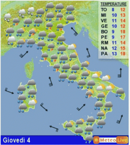 E’ palese che con una situazione siffatta, il tempo non potrà essere buono sulla nostra Penisola. Gli eventuali rovesci avranno carattere locale ed interesseranno (secondo la corsa attuale) più direttamente il centro e il meridione.