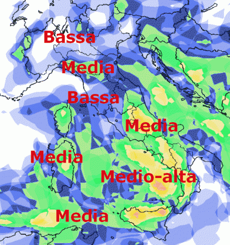Secondo le mappe attuali, le probabilità di pioggia più elevate (probabilità MEDIA o MEDIO-ALTA) le avremo al centro, sulle Isole e al meridione. Qualche pioggia potrebbe arrivare pure al nord, anche se la probabilità di pioggia per queste zone sembra essere più bassa.