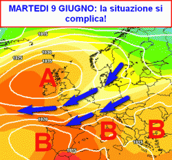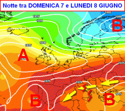 L’azione di limaggio di tali correnti ai danni della parte più forte dell’anticiclone risulta molto più evidente nella cartina di previsione valida per la notte tra domenica 7 e lunedì 8 giugno.