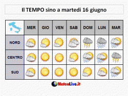 martedì 16 giugno: instabile su tutto il Paese con rovesci sparsi e temporali, più intensi al centro-sud, a tratti schiarite. Temperature gradevoli al nord e al centro, in calo nel corso della giornata al sud.