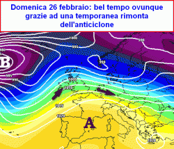 domenica 26 febbraio: bel tempo e clima diurno mite, salvo sotto locali nebbie che potranno ancora gravare sulla bassa Valpadana.