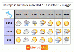 mercoledì 10 maggio: temporaneo miglioramento ma in giornata nuovo aumento della nuvolosità al nord con annessi isolati rovesci. Temperature minime in calo, massime in aumento al centro-sud, in lieve calo al nord.