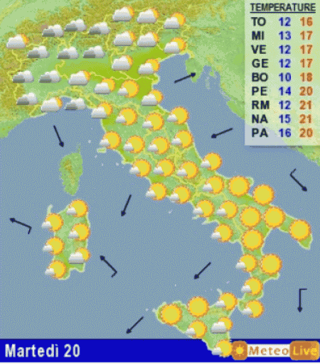 RIASSUMENDO: da martedi 20 fino a giovedi 22 ottobre bel tempo e mite al centro e al sud, nubi al nord con rischio di piogge al nord-ovest specie giovedì. Rialzo termico generalizzato.