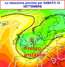 Sabato 16 e domenica 17 settembre: instabile al nord e al centro con temporali sparsi, rovesci e calo termico; al meridione bel tempo e caldo moderato specie sulle regioni estreme e sulla Sicilia.