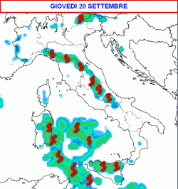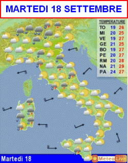 La prima mappa mostra la situazione prevista in Italia per la giornata di domani, martedi 18 settembre.