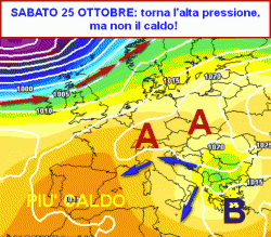 L’ultimo fine settimana di ottobre, invece, potrebbe vedere il ritorno dell’alta pressione sul Mediterraneo, seppure insidiata da correnti fresche di matrice orientale (seconda cartina a lato). Il tempo tenderà a stabilizzarsi nuovamente, ma con temperature decisamente più consone al periodo, senza più scomodare picchi termici estivi sullo Stivale.