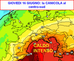 La prima cartina ci mostra le temperature a 1500 metri circa, previste per giovedì 16 giugno. Bersagliata dal caldo la Sardegna, con isoterme alla medesima quota comprese tra +25 e + 28 (che al suolo possono significare il superamento agevole dei 35°).