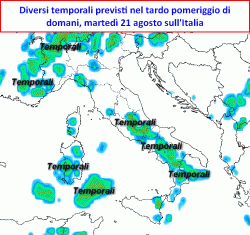 Martedì 21 ancora temporali al sud e su parte del centro. Particolarmente colpita la Sardegna. Tempo più stabile al nord. Temperature estive.