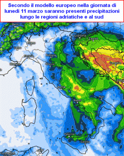 Nel corso di domenica 10 affluirà nuovamente aria più umida su Liguria e regioni tirreniche, a segnalare il passaggio di un fronte che, nella giornata di lunedì 11 marzo, impegnerà segnatamente le regioni adriatiche e meridionali, determinando precipitazioni a prevalente carattere di rovescio.
