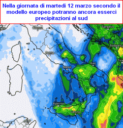 martedi 12 marzo: al mattino ancora nubi al sud e sull’Abruzzo con brevi precipitazioni, tendenza a miglioramento, bel tempo sul resto d’Italia. Temperature in lieve diminuzione, specie nelle Alpi. Martedi pomeriggio nubi in aumento su Liguria, Toscana, arco alpino.