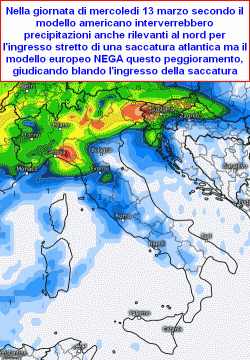 mercoledi 13 marzo: nella notte e nel primo mattino perturbato al nord e sulla Toscana con piogge e rovesci, neve sulle Alpi oltre i 1000m, poi migliora al nord-ovest, piogge su Umbria, Lazio e Campania, ancora asciutto sul resto d’Italia. Temperature in calo al nord e sulle centrali tirreniche.