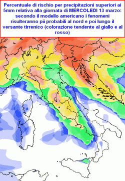 Il modello americano ritiene questo coinvolgimento depressionario del sud molto più modesto ed è già proiettato al potenziale guasto che interverrebbe nella notte su mercoledì 13 e che vedrebbe protagonista quasi tutta la Penisola a partire dal nord e dalle regioni tirreniche, così come mostrano le mappe relative alla probabilità di piogge superiori ai 5mm su queste zone.