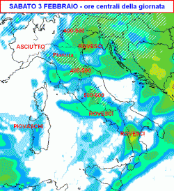 Sabato 3 febbraio: neve localmente fino in pianura su Emilia Romagna e basso Veneto, sopra i 400-600 metri sull’Appennino centro-settentrionale, rovesci a quote inferiori e tempo asciutto al nord-ovest. Ventoso e più freddo ovunque.