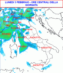 Al centro e al meridione sarà un maltempo piovoso, mentre al nord non si potranno escludere sorprese bianche a bassa quota specie sul nord-ovest (ipotesi comunque ampiamente da verificare).