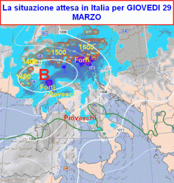 Giovedì 29 marzo: instabile al nord, Toscana, Umbria e alto Lazio con piogge sparse ed occasionali rovesci nevosi sulle Alpi sopra i 1400-1600 metri. Sul resto d’Italia tempo abbastanza buono e mite specie al sud.