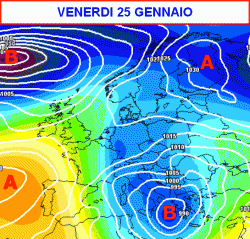 Venerdì 25 gennaio: precipitazioni sul medio-basso Adriatico, zone interne e meridione con neve a bassa quota, per il resto situazione in miglioramento. Molto vento e freddo ovunque.