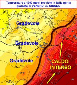La mappa mostra le temperature a 1500 metri previste per la giornata di venerdì 30 giugno. La linea di separazione tra il clima gradevole e il caldo sarà davvero netta e passerà tra il Lazio e l’Abruzzo. A nord di questa linea sarà possibile lo sviluppo di temporali seppure alternate a fasi soleggiate.