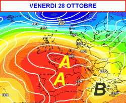 Volgendo lo sguardo oltre e arrivando all’ultimo venerdì di ottobre, la parte più intensa dell’alta pressione si trasferirà sull’Europa occidentale (terza mappa).