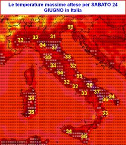 Conferma però il picco di caldo atteso sull’Italia nei prossimi tre giorni. La giornata peggiore sarà sabato 24 giugno; in questo frangente la canicola diverrà insopportabile su diverse zone d’Italia.