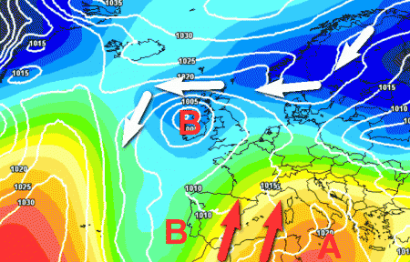 L’aria fredda farà il giro largo, interessando essenzialmente i Paesi del nord Europa (frecce bianche). Da noi prenderà piede il richiamo mite sopra citato con aumenti termici anche sensibili al meridione e sulle Isole, unitamente a qualche pioggia al nord.