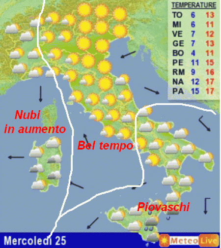 RIASSUMENDO: fino a giovedi 26 novembre poche novità: un po’ di nubi sulla Sardegna, al nord-ovest e al meridione con qualche piovasco in Sicilia, bel tempo e mite altrove.