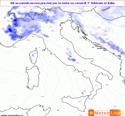 : dalla tarda nottata sino al mezzogiorno neve bagnata sino in pianura su Piemonte, ovest Lombardia e Piacentino, neve da moderata ad intensa su Alpi, Prealpi e relativi fondovalle, neve anche sul versante padano dell’Appennino ligure. Sul resto del nord e sulle regioni centrali tirreniche piogge e rovesci con neve solo sulle cime appenniniche, nubi e precipitazioni in arrivo anche su Campania e Sardegna, nuvolaglia altrove con fenomeni sporadici, ma tempo ventoso, mite al centro, al sud e sulle coste del nord-est, freddo umido su Alpi e nord-ovest. Dal pomeriggio limite delle nevicate in progressivo rialzo anche sulle pianure del nord-ovest.
