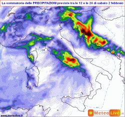 sabato 2 febbraio: al nord-ovest al mattino asciutto, poi nuovo peggioramento piovoso in pianura e nevoso nelle Alpi con limite a 500-900m, sul nord-est molto nuvoloso con precipitazioni, nevose oltre i 700-1000m, al centro e al sud tempo instabile sul versante tirrenico con piogge e temporali, fenomeni anche intensi tra Lazio e Campania, tempo migliore lungo l’Adriatico, peggiora con piogge su Sicilia e Sardegna, limite della neve in calo lungo la dorsale appenninica del centro sino a 700-900m. Temperature in calo al centro e poi anche al sud, in lieve aumento al nord-ovest, in calo in pianura al nord-est.