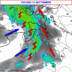 RIASSUMENDO: fino a mercoledì 14 settembre bel tempo sull’Italia a parte qualche temporale nel pomeriggio sulle Alpi e sull’Appennino centro-meridionale. Giovedì 15 peggiora al nord, sulla Sardegna e sul Tirreno con piogge e temporali sparsi, anche intensi, altrove tempo asciutto e in parte soleggiato. Venerdì 16 settembre instabile al nord e al centro con temporali alternati a schiarite, per il resto tempo abbastanza buono. Meno caldo ovunque. Sabato 17, domenica 18 e lunedì 19 settembre ancora diffusa instabilità con fenomenologia più spiccata al centro.
