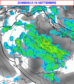 Domenica 18 settembre, secondo gli ultimi aggiornamenti, un nuovo peggioramento potrebbe mettere sotto torchio l’Italia, con fenomeni concentrati soprattutto al centro e al meridione (seconda mappa).