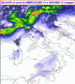 Si accendono i colori nelle carte previsionali, per segnalare la possibilità di piogge anche intense che dovrebbero interessare il settentrione indicativamente nelle giornate di mercoledì 11 e giovedì 12 maggio (prima cartina).