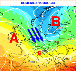 Ecco l’ansa depressionaria che abbraccerà ancora il nord Italia e aria più fredda (frecce blu) che si farà sentire segnatamente sui settori centro-settentrionali del Continente.