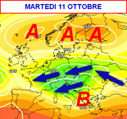Martedì 11 ottobre tempo moderatamente instabile e più freddo specie al nord e al centro. Possibili precipitazioni al nord-ovest, nevose sopra i 1000-1200 metri sulle Alpi, rovesci anche al meridione, migliora ovunque in serata, ventoso su tutti i mari. Mercoledì 12 ottobre ultimi rovesci al meridione in via di attenuazione, bel tempo altrove, ma con nubi in aumento al nord-ovest nel pomeriggio, senza fenomeni, temperature in aumento. Tra giovedì 13 e sabato 15 ottobre tempo perturbato a fasi alterne al nord, alto/medio Tirreno e Sardegna con piogge e temporali anche forti, altrove nubi sparse con aumento delle temperature e tempo asciutto. Tra domenica 16 e lunedì 17 ottobre instabile al nord e sul Tirreno con possibili piogge, più sole altrove, mite ovunque.