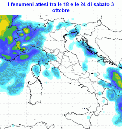 sabato 3 ottobre: al nord-ovest nelle prime ore forti rovesci o temporali sulla Liguria, in trasferimento attenuati sulla Lombardia e sul basso Piemonte ma con tendenza ad attenuazione dei fenomeni già dal mattino; sul nord-est nuvoloso o molto nuvoloso con piogge sparse o qualche rovescio, ma anche qui tendenza ad attenuazione dei fenomeni; verso sera nuovo peggioramento al nord-ovest con piogge, anche temporalesche in Liguria. Al centro nuvolosità irregolare con ampie schiarite e tempo almeno in parte soleggiato, al sud maltempo sulle regioni joniche, segnatamente il Salento, la costa lucana e il Crotonese, poi verso sera solo sul Salento, per il resto nubi sparse con prevalenza di schiarite e tempo asciutto. Temperature in aumento.