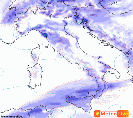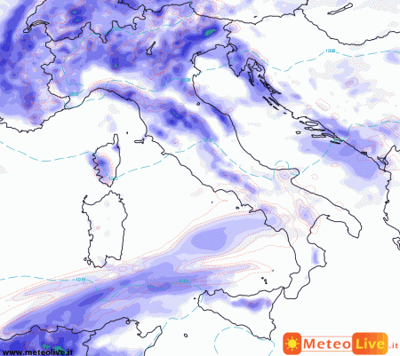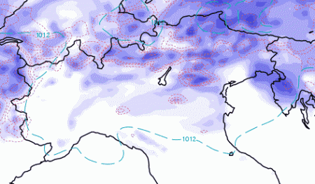 Giovedì 30 invece i fenomeni si localizzeranno al nord e, dopo una breve comparsa ad ovest, si andranno localizzando tra est Lombardia e Venezie, per poi abbandonare il nord entro sera, come si nota chiaramente da questa mappa: