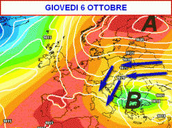 Arrivando con un balzo virtuale alla giornata di giovedì 6 ottobre, il ritiro verso ovest dell’alta pressione favorirà un afflusso di aria più fresca dall’est europeo, con parziale coinvolgimento del versante adriatico e del meridione (seconda mappa).