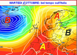 La prima mappa, valida per martedì 4 ottobre, mostra una fase di bel tempo sull’Italia, segnatamente sui settori occidentali della Penisola e sulle Isole. Un tempo tutto diverso campeggerà invece sull’Europa orientale, dove agirà una vasta depressione fredda con tempo molto instabile al suo interno.