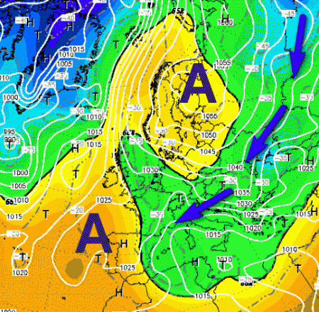 Se guardiamo l’immagine successiva riferita alla situazione prevista per venerdì 15 in Europa si nota invece quanto sia debole e solo di natura termica l’anticiclone posizionato sulla Scandinavia, da lì si capisce che le correnti da WNW avranno la meglio sul freddo spingendolo via rapidamente lontano dalla Penisola.