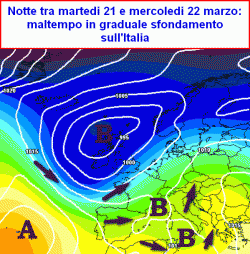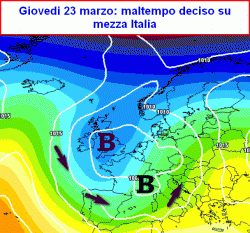 Nella giornata di giovedì 23 marzo invece ecco entrare in modo più deciso il "maltempo" con una perturbazione più efficace, accompagnata anche da un minimo di pressione al suolo sul nord Italia con piogge diffuse, temporali sulle centrali tirreniche ed anche qualche nevicata finalmente sulle Alpi oltre i 1400-1500m.