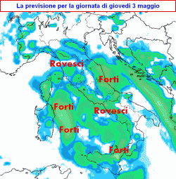 I fenomeni associati saranno quelli visibili nella prima mappa, che rappresenta la situazione attesa per giovedì 3 maggio in Italia.