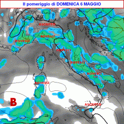 La previsione per il pomeriggio di domenica 6 maggio (seconda mappa) individua una collana di rovesci o temporali che agiranno lungo la spina dorsale dell’Italia, sconfinando in parte anche lungo le coste prima di sera (specie quelle del Tirreno).