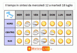 mercoledì 12 luglio: bel tempo ovunque, salvo occasionali temporali su centro est Alpi e Friuli Venezia Giulia nel tardo pomeriggio-sera; al centro-sud ancora molto caldo, ma calura notevole anche su Emilia-Romagna; punte di 38-39°C.