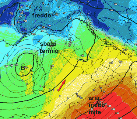 Da notare anche tra venerdì 8 e sabato 9 il notevole rialzo delle temperature previste al sud (qui con punte primaverili) e in parte anche sul Lazio, mentre sul resto del centro il freddo insisterà ancora, mentre al nord risulterà pungente soprattutto domenica. Questa la mappa termica prevista a 1500m dal modello americano per la mattinata di domenica 10 gennaio: