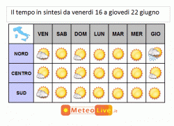 venerdì 16 giugno: al nord-est passaggi nuvolosi e possibili rovesci su zone alpine più orientali e Friuli Venezia Giulia, al nord-ovest sereno e tendenza al Favonio caldo da nord-ovest; bel tempo altrove, salvo residui addensamenti sulla Puglia, associati a brevi spunti temporaleschi pomeridiani. Temperature in aumento.