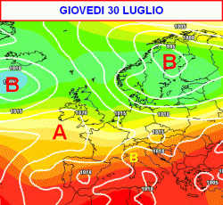 Le correnti atlantiche che scorrono sull'Europa centrale proporranno due code perturbate che lambiranno il settentrione, con temporali nella giornata di giovedì 30 luglio e sabato 1 agosto. A seguire si prevede il ritorno dell'alta pressione e del caldo su tutta l'Italia.