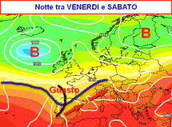 La prima cartina inquadra la situazione prevista per la giornata di giovedì in Europa ed in Italia. Si nota molto bene il settentrione lambito dal flusso atlantico instabile, con la creazione di un minimo secondario in prossimità del Mar Ligure. Qualche temporale si spingerà anche nelle zone interne dell’Italia centrale, mentre al meridione e sulle Isole il tempo non subirà cambiamenti sostanziali.